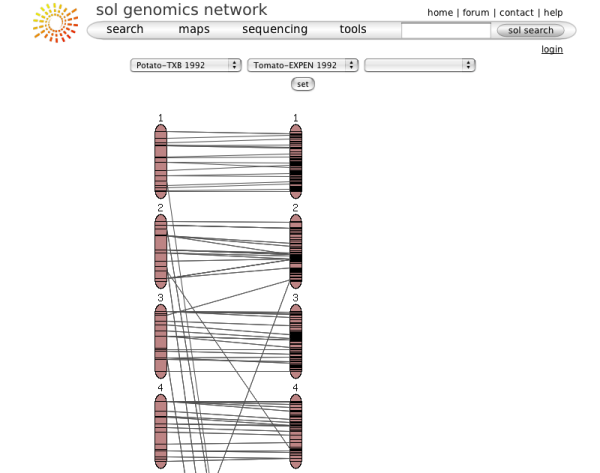 Clicking on the "view entire map" link in the chromosome view displays the map comparison view. In total, three maps can be compared at the same time. Below is a screenshot of a comparison of tomato and potato.